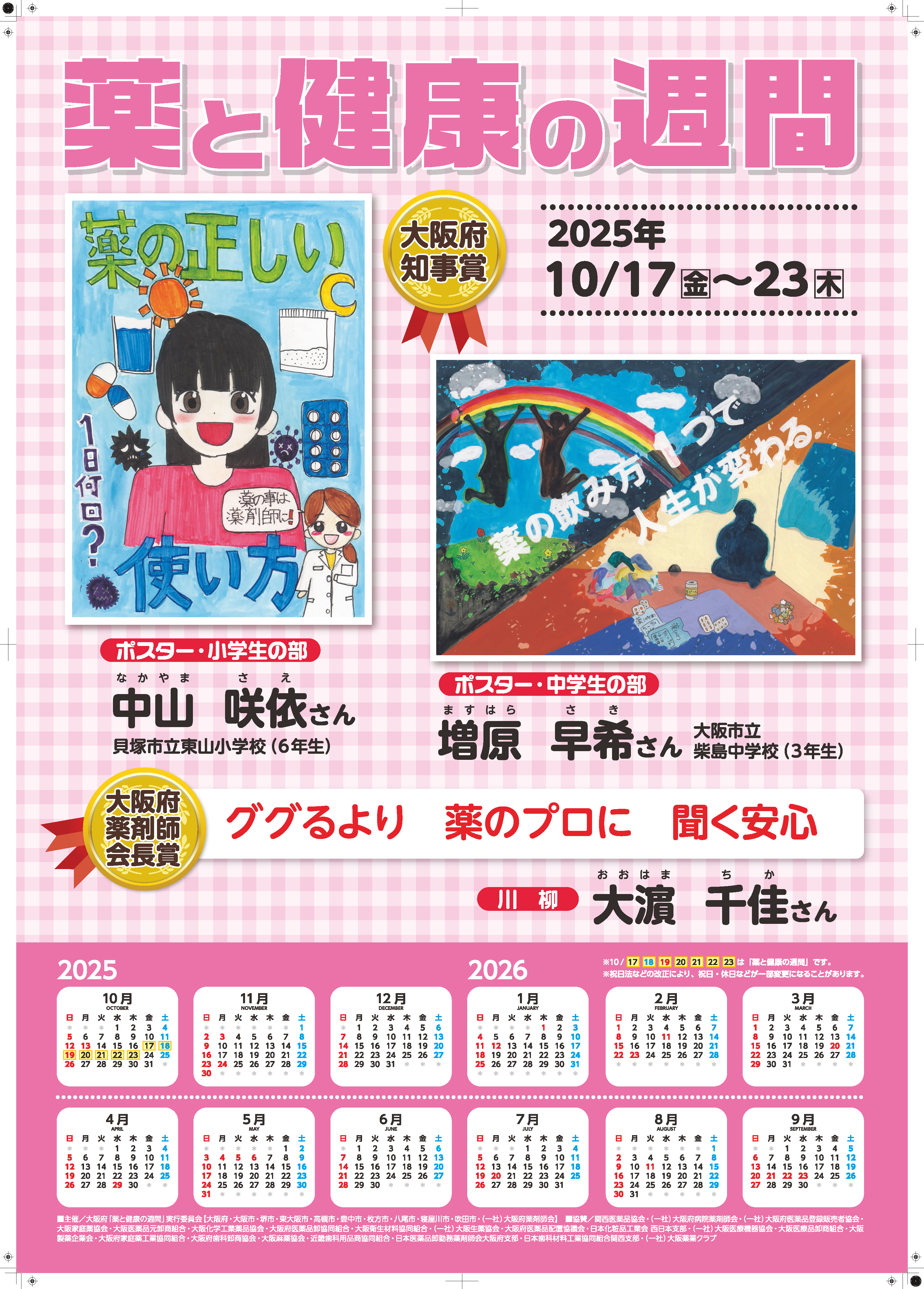 また、大阪府知事賞、大阪府薬剤師会長賞及び各優秀賞に入賞されました皆様につきましては、表彰状及び記念品を10月19日の府民のつどいにてお渡しさせていただきます。